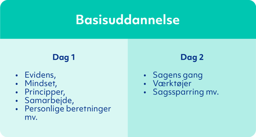 Et basisforløb består af to undervisningsdage. Undervisningsformen er praksisnær, og deltagerne får mulighed for at arbejde med konkrete værktøjer. Der vil i forløbet være fokus på bl.a. evidens, mindset, samarbejde og sagssparring.