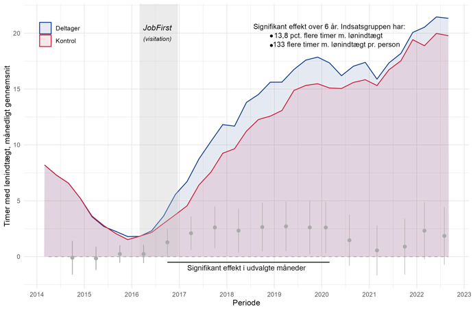 Anm.: Figuren illustrerer antallet af gennemsnitlige løntimer pr. måned. Timerne beregnes som beskæftigelsesgrad*160,33. Effekten (differencen ml. deltager- og kontrol) samt konfidensintervaller er angivet med grå. Effekten i en måned er statistisk signifikant i tilfælde, hvor konfidensintervallet ikke overlapper 0.