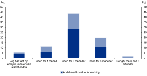 Anm.: Figuren viser andelen af respondenter, der angiver følgende kategorier: 'har fået nyt job', 'inden for 1 måned', 'inden for 3 måneder', 'inden for 6 måneder' eller 'mere end 6 måneder'. Andelen med korrekte forventninger er defineret som den procentdel i hver kategori, der faktisk får job inden for den angivne periode. Man betragtes som at have fået et job, hvis man senest i måneden efter den angivne periode er afgået fra ledighed og har modtaget lønindtægt. En person, der for eksempel angiver at de tror på job 'inden for 3 måneder', kan derfor i praksis modtage sin første løn i den fjerde måned, og stadig have korrekte forventninger. Data er nærmere beskrevet i boks 1.