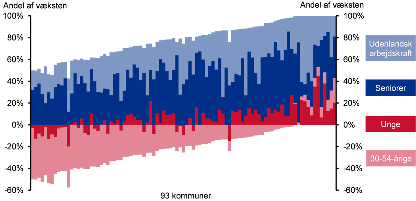 Seniorer og udenlandsk arbejdskraft trækker størstedelen af jobvæksten i 90 kommuner, jf. figur 3. I de resterende tre kommuner analysen kigger på er det de unge, der står for den største stigning i beskæftigelsen. Gruppen af danske statsborgere mellem 30 og 54 år står derimod ikke for den største stigning i nogen af landets kommuner. Det skyldes i høj grad, at befolkningstallet i denne aldersgruppe er faldet.