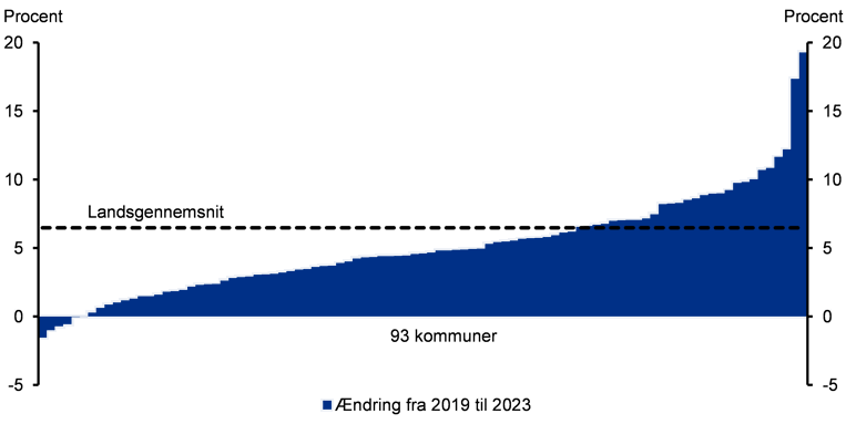 Anm.: Figur 1 viser den procentvise ændring i lønmodtagerbeskæftigelsen blandt de 18 til 75-årige fra 2019 til 2023. Søjlerne repræsenterer 93 af landets kommuner. De fem kommuner, der ikke er repræsenteret er ø-kommunerne, og disse er udeladt grundet små populationer.