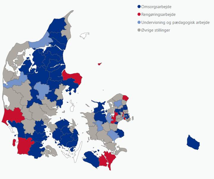 I 52 af de 93 kommuner er det de samme tre stillingsbetegnelser, der er vokset mest i perioden. Det gælder for omsorgsarbejde, undervisning og pædagogisk arbejde samt rengøringsarbejde.