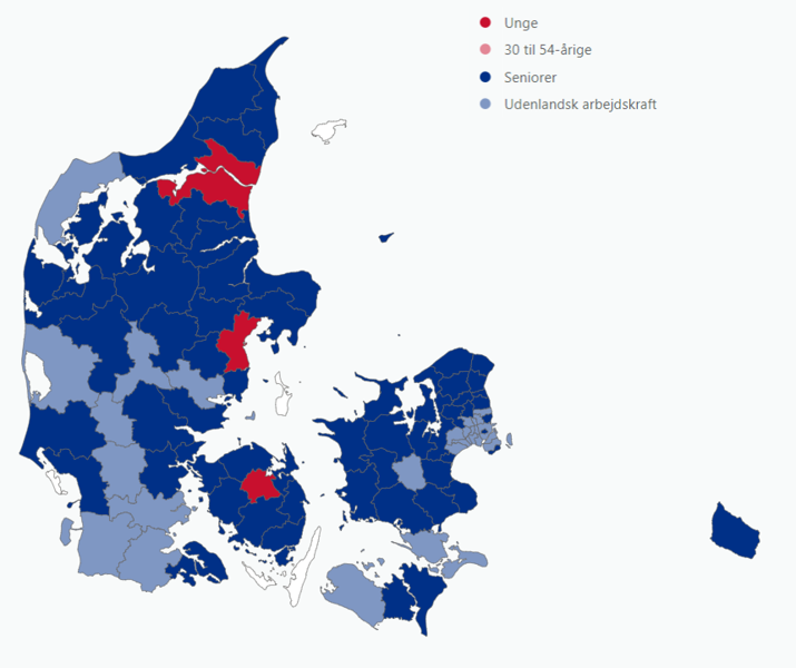 Anm.: Figur 3 viser, hvilken gruppe der i hver kommune har oplevet den største absolutte ændring i lønmodtagerbeskæftigelsen fra 2019 til 2023. En rød farve angiver, at danske statsborgere mellem 18 og 29 år har oplevet den største absolutte ændring fra 2019 til 2023. En lyserød farve angiver, at det er blandt danske statsborgere mellem 30 og 54 år, der er sket den største absolutte ændring, en mørk blå farve blandt danske statsborgere mellem 55 og 75 år og en lys blå farve angiver tilsvarende for de udenlandske statsborgere. 93 af landets kommuner er udfyldt, og de fem ø-kommunerne er ikke repræsenteret grundet smalt datagrundlag. Kategorierne udgøres af danske statsborgere fordelt på tre aldersintervaller, samt udenlandske statsborgere. Udenlandske statsborgere dækker ikke over personer, der har opholdsgrundlaget RUT.