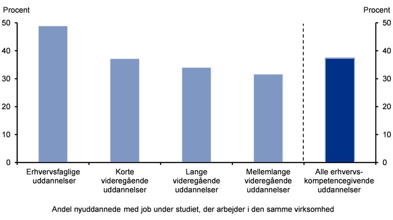 Ud af dem med erhvervserfaring blev 37 procent af de nyuddannede ansat i samme virksomhed, som de arbejdede i under uddannelsen. Det er særligt nyuddannede fra erhvervsfaglige uddannelser, der bliver i den samme virksomhed, jf. figur 1.