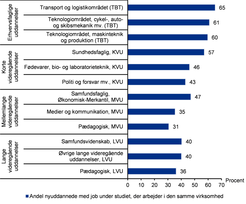 For nyuddannede på de videregående uddannelser er andelen mellem 12 og 17 procentpoint lavere. Her forbliver omkring 32 til 37 procent af de nyuddannede i den virksomhed, de arbejdede i under deres studie, afhængigt af uddannelsestype.