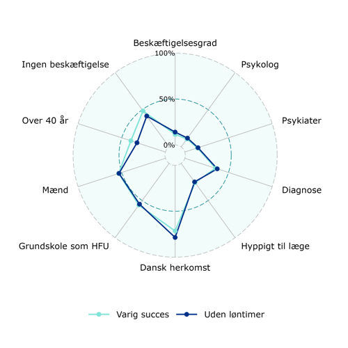 Det gælder fx i forhold til tidligere tilknytning til arbejdsmarkedet, sundhedshistorik, uddannelsesniveau og demografi. Der er heller ikke væsentlige forskelle mellem dem, der opnår varig succes med løntimer, og dem, som får løntimer, men senere vender tilbage til kun at modtage ydelse. - Resultaterne går igen på ydelsesgruppeniveau